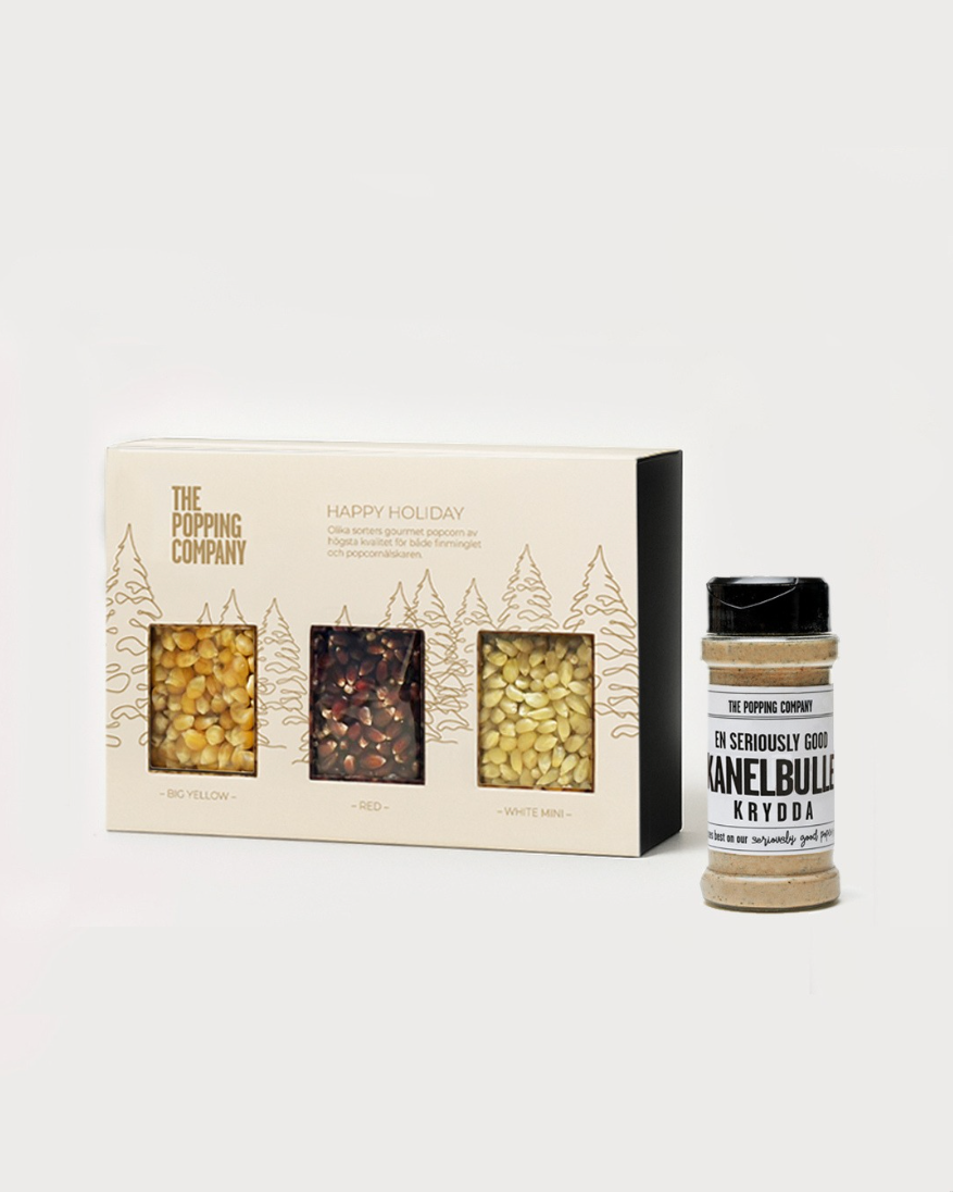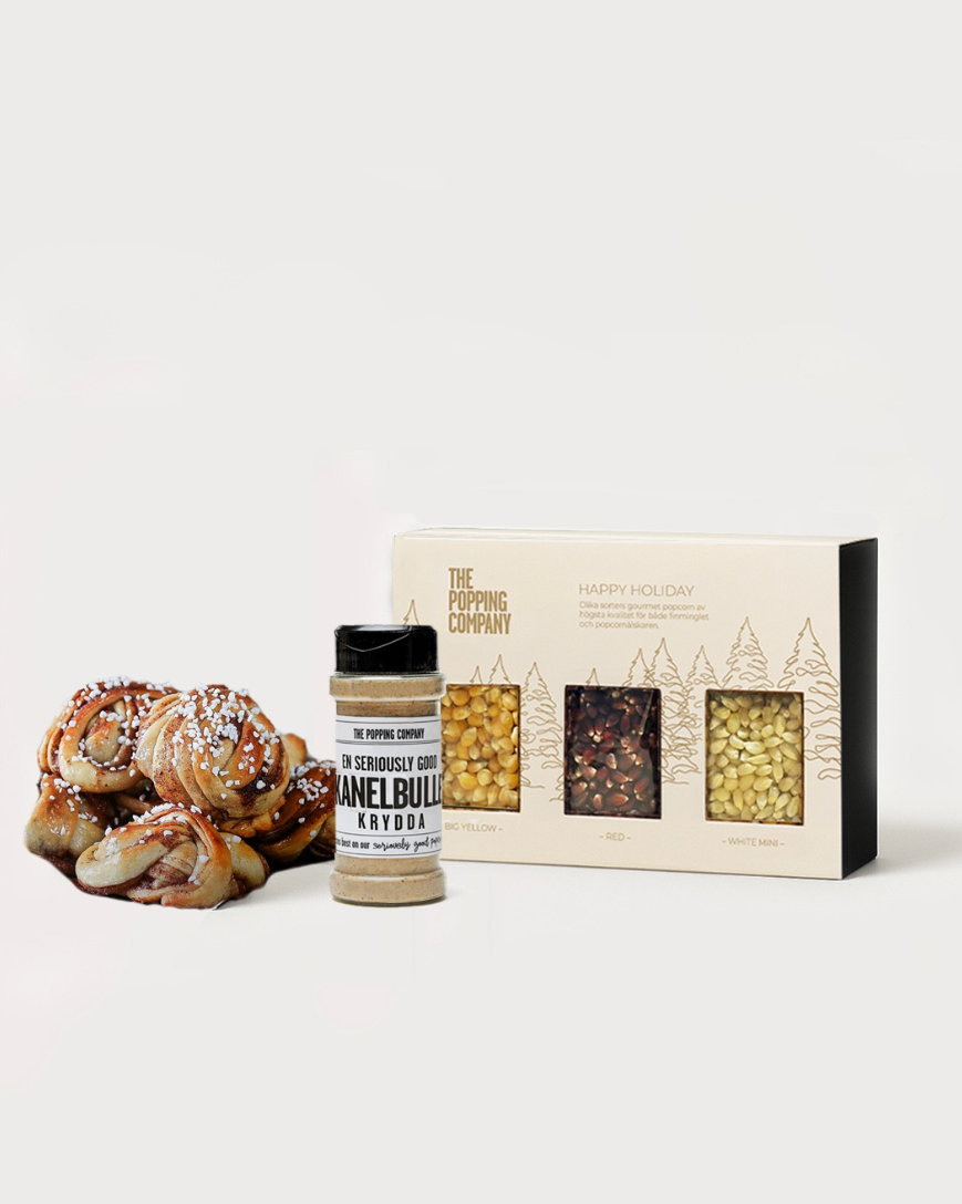 Vårt julklappstips består av en presentförpackning vi kallar Happy Holiday. Fylld med tre av våra finaste popcornsorter. Dessutom har vi tagit fram en supergod och julig krydda - en krydda med smak av kanelbulle – perfekta för vinterkvällar, julfilmer och alla små stunder där du vill att julen ska vara god.