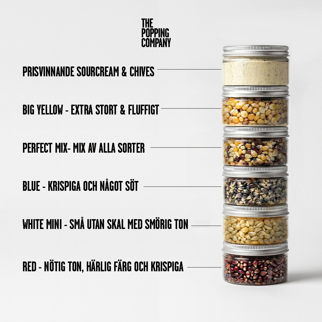 Fem gourmetpopcornsorter: Big Yellow, White Mini, Red, Blue & Perfect Mix